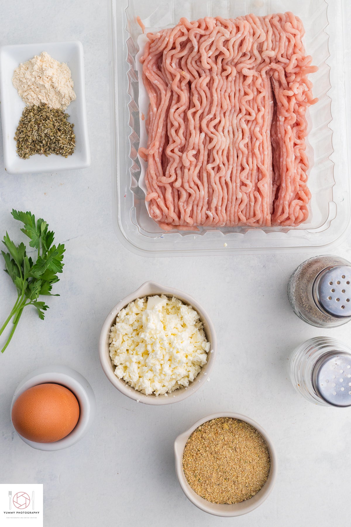 Main ingredients: Ground chicken, garlic powder, dried oregano, feta cheese, egg, breadcrumbs